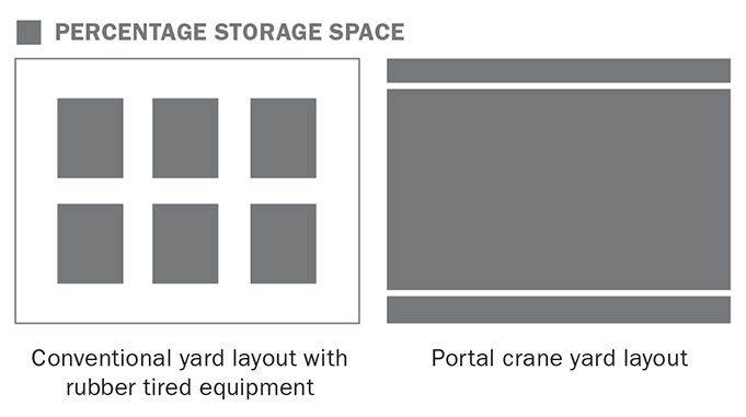 相比輪胎式設(shè)備,門座式起重機(jī)在儲料場占用的空間更小。 借助該設(shè)備,可實(shí)現(xiàn)高達(dá) 75 英尺的垂直存儲,同時還能增加儲料場的三維存儲容量。